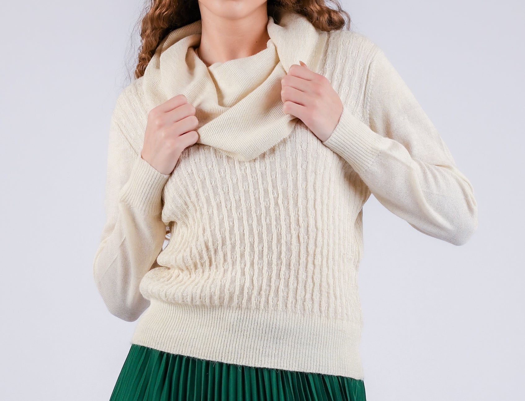 Experience the coziness of our Ivory Dream Cascade Turtleneck Light Weight Sweater, crafted from delicate Baby Alpaca Wool. This finely designed piece presents sophisticated vibes with a multitude of styling options.